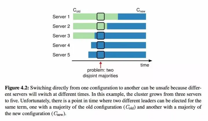 如上图所示,在集群状态变更过程中,在红色箭头处出现了两个不相交的多数派(Server3、Server4、Server 5 认知到新的 5 Node 集群;而 1、2 Server 的认知还是处在老的 3 Node 状态)。在网络分区情况下(比如 S1、S2 作为一个分区;S3、S4、S5 作为一个分区),2个分区分别可以选举产生2个新的 Leader(属于configuration< Cold>的 Leader 以及 属于 new configuration < Cnew > 的 Leader) 。