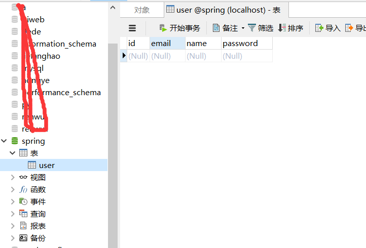 spring的数据库。 - 创建一个名为user的数据表,表包括id、email、name、password四个字段。
