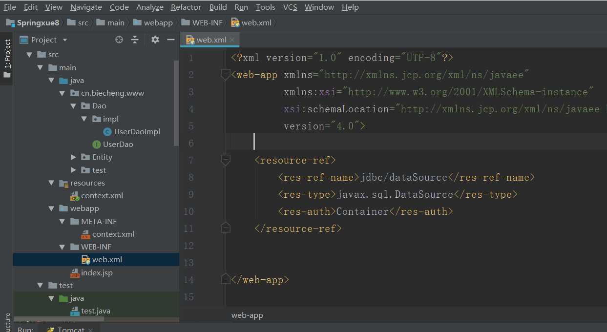 由于TomcatDBCP是内置在Tomcat容器的连接池,所以要使用这个连接池得运行Tomcat,接下来我们编写在Tomcat容器中实现连接池操作数据库。