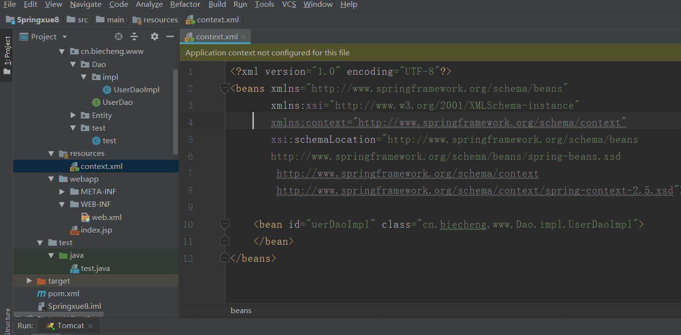 - 我们在resources中新建一个context.xml进行配置Bean。 context.xml: