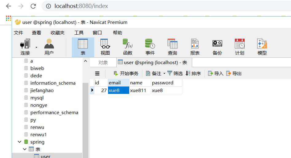 我们在IDEA运行后,在浏览器中输入http://localhost:8080/index,即可在数据库中发现数据已插入。