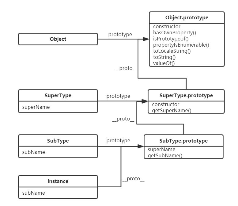 以上定义了两个类型,SuperType 和 SubType,SubType 构造函数将 prototype 属性指向了 SuperType 构造函数的实例,以此来实现继承,因为 SuperType 的 prototype 属性是 Object 的实例,所以: