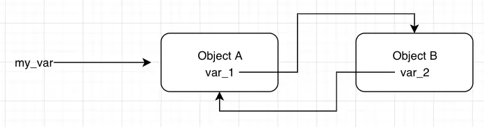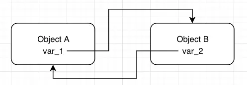 与之前不同的是,ObjectB内的变量var_2如果指向ObjectA的话,如果取消my_var 对ObjectA的引用,按照内存管理的规则,最终会导致一个内部循环