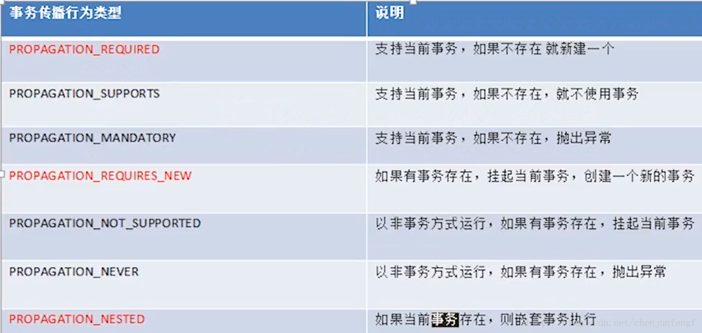 - Spring中提供的七种事务传播行为 如图: