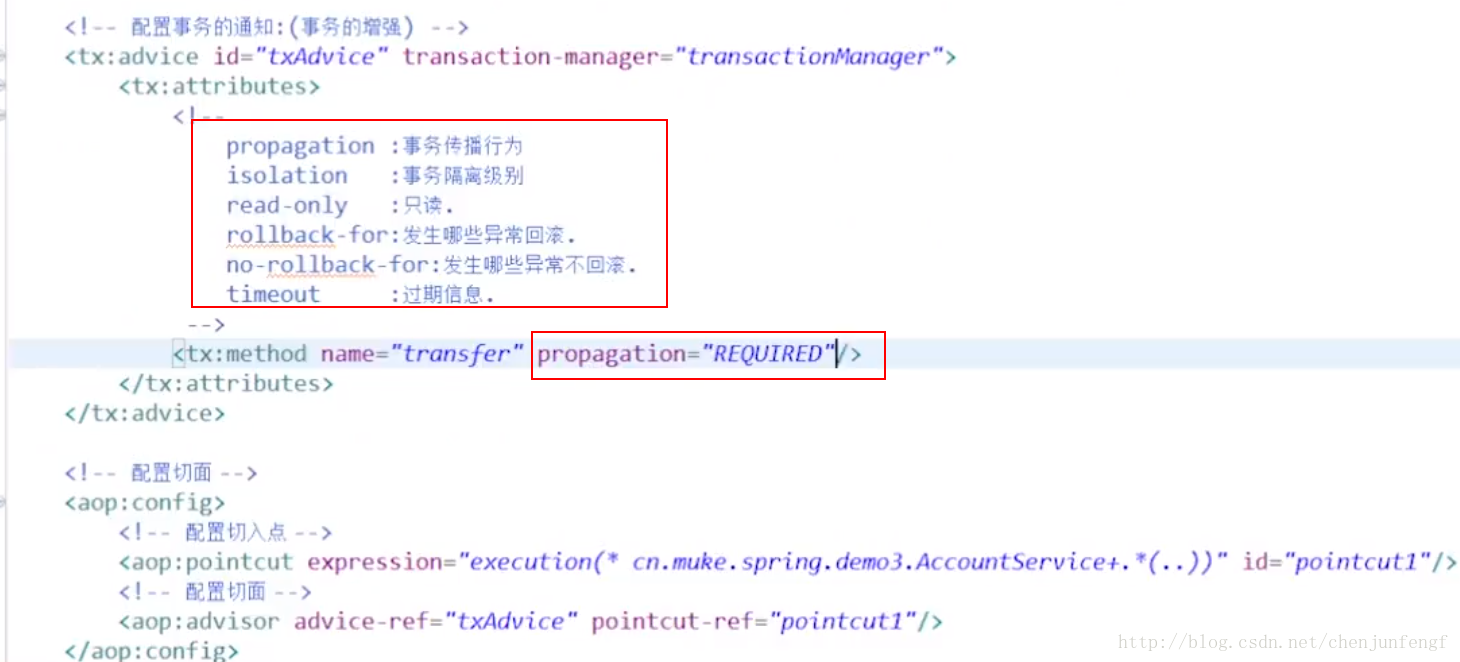 <bean id="transactionManager" class="org.springframework.jdbc.datasource.DataSourceTransactionManager"> <property name="dataSource" ref="dataSource"/> </bean> <!-- 配置事务通知 --> <tx:advice id="txAdvice" transaction-manager="transactionManager"> <tx:attributes> <tx:method name="search*" read-only="true"/> <tx:method name="get*" read-only="true"/> <tx:method name="create*" read-only="false"/> <tx:method name="update*" read-only="false"/> <tx:method name="delete*" read-only="false"/> <tx:method name="*" propagation="REQUIRED" rollback-for="java.lang.Exception"/> </tx:attributes> </tx:advice> <!-- 配置切面 --> <aop:config> <!-- 配置切入点 --> <aop:pointcut id="txPointcut" expression="execution(* com.brh.p2p.admin.service.*.*(..))" /> <!-- 配置切面 --> <aop:advisor advice-ref="txAdvice" pointcut-ref="txPointcut" /> </aop:config>``` - 如图配置信息: