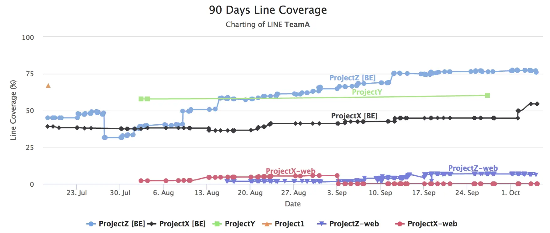 基于团队的代码覆盖率图表显示了团队中每个仓库的覆盖趋势,因此无需导航到每个 SonarQube 项目页面。通过将这种类型的图表并排放置,可以很容易地比较不同团队的表现。