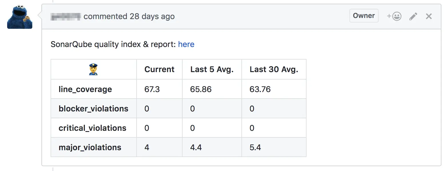 提交给 PR 的每次提交都会触发一个 webhook 来发布 github 评论,如下所示。这是为了提醒 PR 创建者添加测试并修复在此 PR 内部发现的新漏洞,这比在两周后把更改发布到生产中更为有效。为了提高质量指标,评审人还应该帮助找出被评审人遇到问题的原因。
