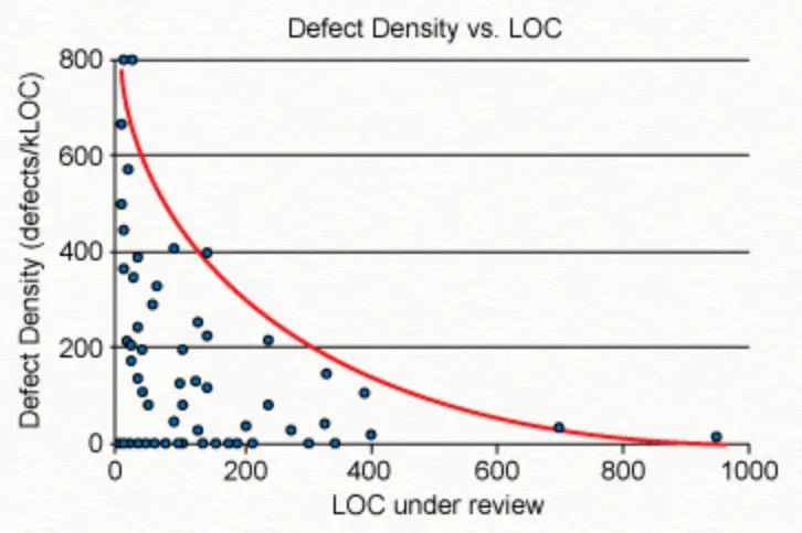 以合理的量级,较平稳的速度及利用有限的时间内进行代码评审,可以得到最有效的评审结果。超过 400 LoC,发现缺陷的能力会降低。低于 300 LoC/hr 时检验效率是最好的。