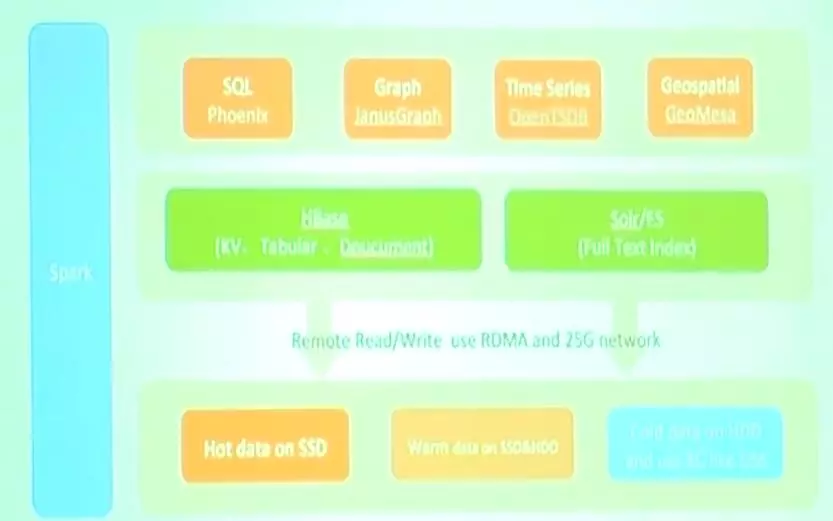 由于HBase部署的节点访问磁盘都是远程读的,因此我们能做到动态调整磁盘大小,做到完全弹性。这里面还有一个多模式,在云HBase上除开HBase本身的KV功能以外,我们还架设了一些其他的开源组件。最底下的存储层上,目前我们的应用数据场景主要有两块,一般的数据是放在云盘,冷数据放在OSS。