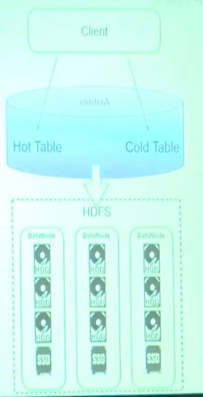 如果是传统的开源的HBase要做冷热分离,方案只能是搞两个集群,一个集群是SSD的配置,负责在线查询,另一个集群是机械盘HDD的配置。 这两张表之间需要手动进行同步,并且客户端需要感知两个集群的配置。