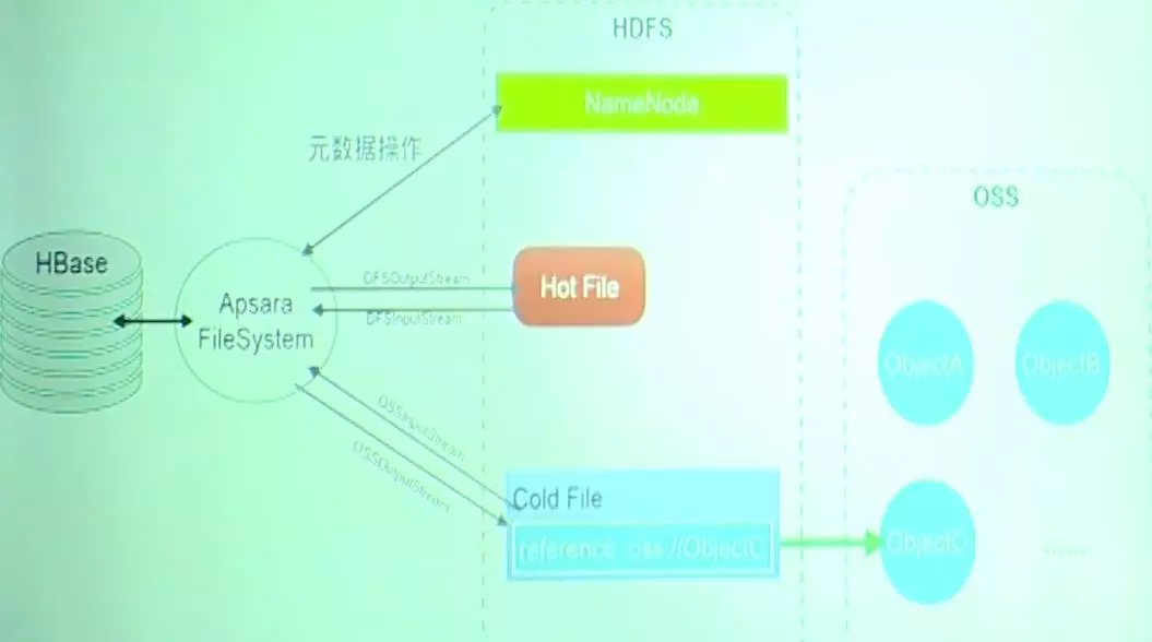 云数据操作通过ApsaraFileSystem直接请求能用的进行操作,热表的数据调用Hadoop的FileSystem,冷数据会在HDFS里创建一个文件,这个文件有一个属性的标记表示该数据是冷的,读冷文件时候会把读通道转发到OSS上,然后构建一个OSS的input stream和OSS output stream。