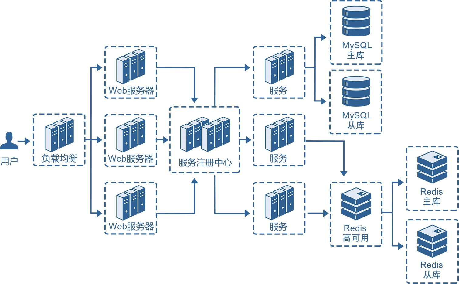 在这个阶段,除了必须保证满足业务的功能型需求,还要更多考虑非功能性需求,比如,通过前端负载均衡提供业务分流的能力,根据用户的特征进行不同的流量转发;数据库提供主备的能力,两者之间通过数据同步进行数据备份,当主数据库发生故障后,应用可以自动切换到备份的服务器来为用户提供服务;在用户体验方面,可能会引入缓存、CDN等基础服务来提供性能加速。