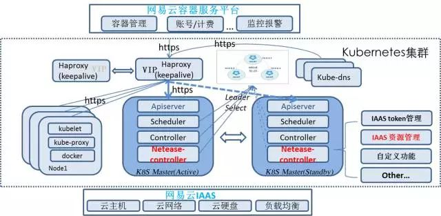 上图是网易云容器服务平台的架构,网易云的容器服务部署在底层的IaaS平台之上,需要动态依赖底层的计算资源来创建云网络、云硬盘、Node节点等资源。通过网易云自研Netease Controller组件,可以监听事件事先准备好底层的硬件资源;