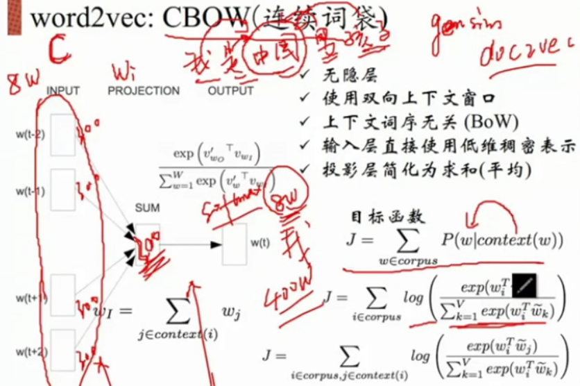 NNLM是通过前n-1个词来预测第n个词,CBOW的做法是通过当前词的周边词来预测当前词,例如:我 是 中国 男 孩子,通过"中国"这个词的前后2个词来预测当前这个"中国"。