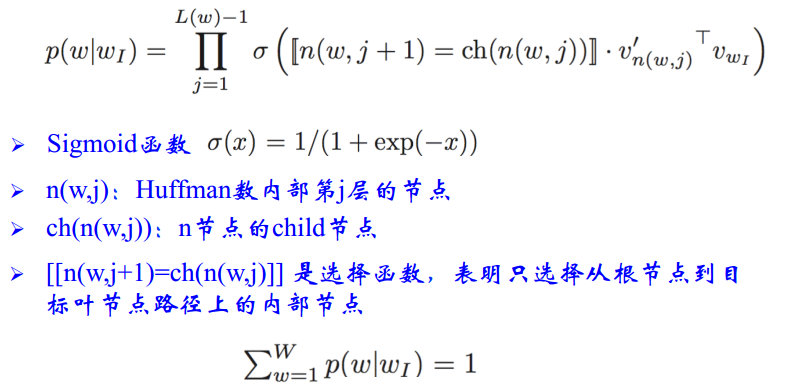 非叶子节点都会有一个权重θ,即图中的黄色节点。树中的每个节点都是二分类,二分类器的概率相乘,对其相乘取对数变成求和,让这个求和(概率)越大越好。