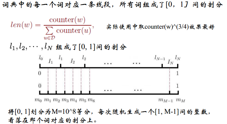 在采样前,我们将这段长度为1的线段划分成M等份,这里M>>V,这样可以保证每个词对应的线段都会划分成对应的小块。而M份中的每一份都会落在某一个词对应的线段上。在采样的时候,我们只需要从M个位置中采样出neg个位置就行,此时采样到的每一个位置对应到的线段所属的词就是我们的负例词。