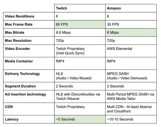 两种方法都使用H.264和AAC,两者都使用受Widevine和Playready保护的2秒fMP4片段,两者都使用基于清单操作的SSAI插入策略。但是,Twitch的内部编码,CDN和封装架构使他们能够以更高的帧速率提供更低延迟的流。而亚马逊具有显着更高的顶级比特率和更全面的设备占用空间的优势。