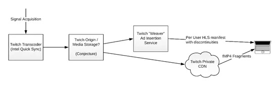 正如我们几周前在Demuxed上了解到的那样,Weaver是Twitch的HLS广告插入服务,它通过声明播放列表中的不连续性并插入广告内容的片段来将广告拼接到视频流中。这种方法在业界是相当标准的,并且比使用多周期DASH要简单得多。
