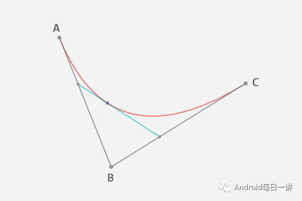一条二阶贝塞尔曲线在起点,结束点,控制点都确定的情况下也就能确定,接下来要解释如何通过这三个点绘制一条贝塞尔曲线。对于 Android来说我们只需要知道这三个点,就能通过Path.cubicTo这个方法绘制出一跳贝塞尔曲线,不需要关心其中的实现原理。