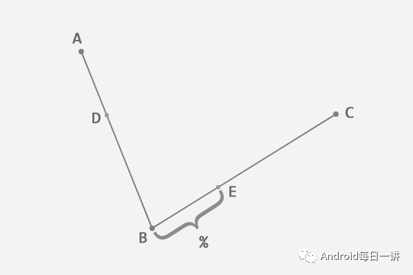 下面对原理解释一下,一条曲线是由多个点连接起来的,绘制曲线的过程就是找这些点并连接起来的过程。以A为起点,C为终点,B为控制点的话,要找绘制点,首先从A到B中间随意找一个点D,