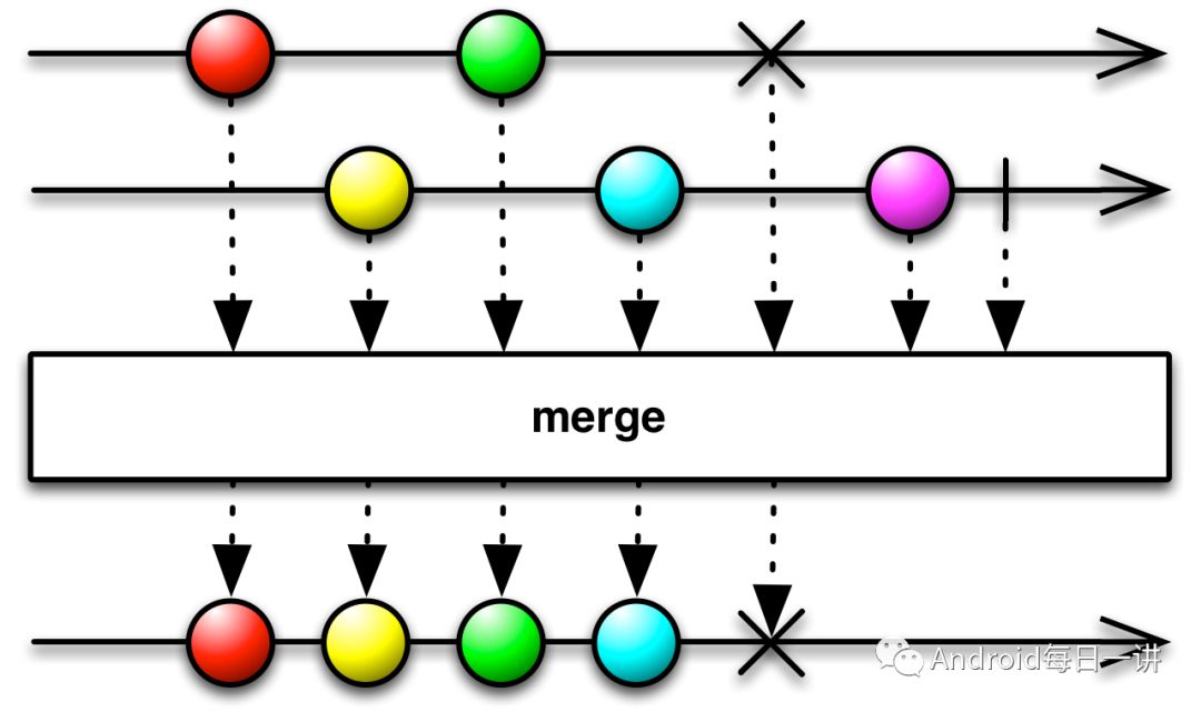 merge()是一个非常有意思的operator,它把两个异步源的数据合并之后再发送给observer。