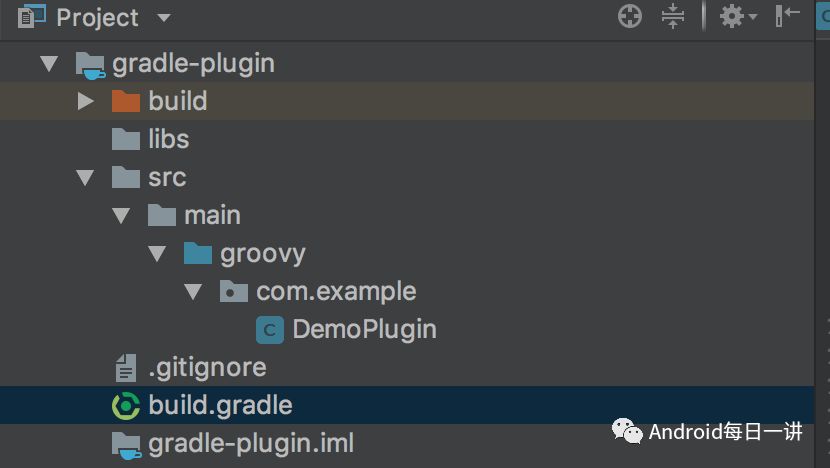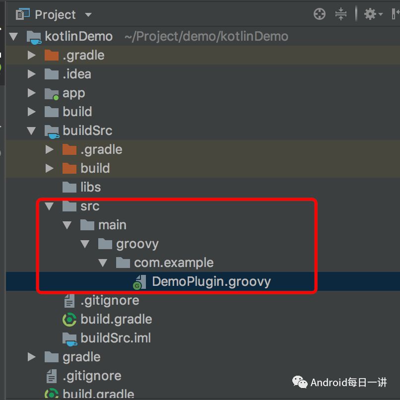 package com.exampleimport org.gradle.api.Pluginimport org.gradle.api.Projectclass DemoPlugin implements Plugin<Project>{ @Override void apply(Project project){ println("DemoPlugin in buildSrc Module") }}