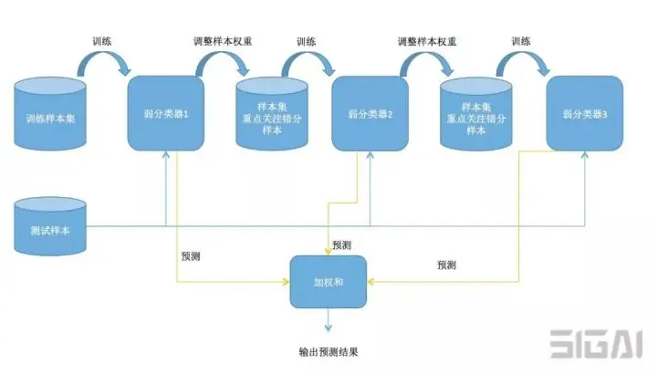根据计算公式,错误率低的弱分类器权重大,它是准确率的增函数。AdaBoost训练和预测算法的原理可以阅读SIGAI之前的公众号文章“大话AdaBoost算法”,“理解AdaBoost算法”。AdaBoost算法的核心思想是: