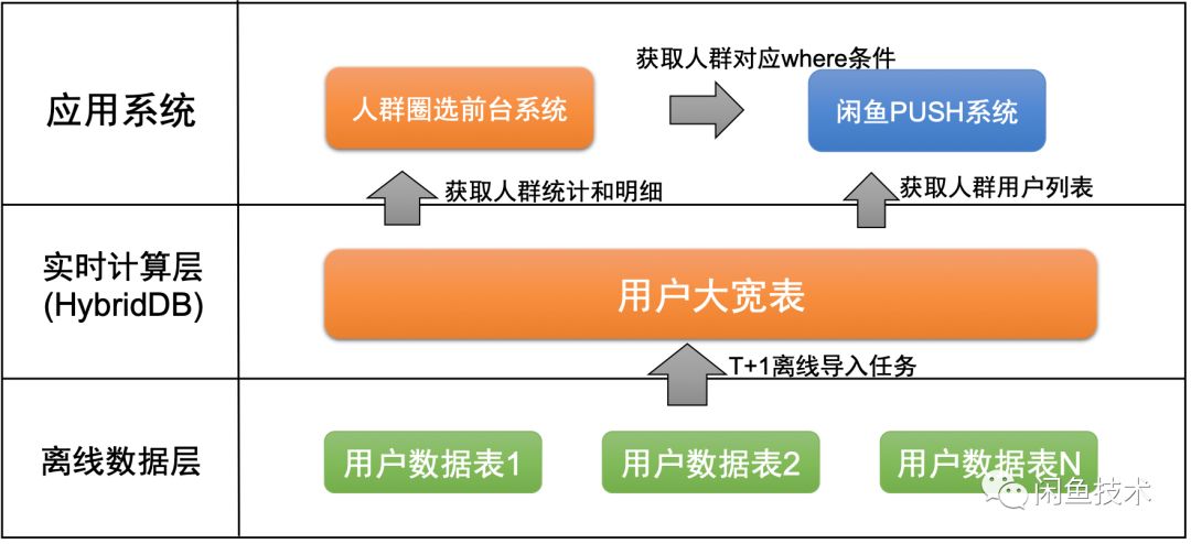 实时计算层:根据人群的筛选条件,从用户大宽表中,查询符合的用户数量和用户ID列表,为应用系统提供服务。