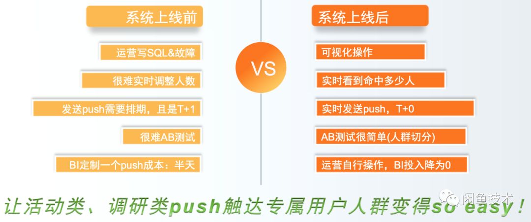 消息推送(PUSH)是信息触达用户最快捷的手段。闲鱼比较常用的PUSH方式,是先离线计算好PUSH人群、准备好对应PUSH文案,然后在第二天指定的时间推送。一般都是周期性的PUSH任务。但是临时性的、需要立刻发送、紧急的PUSH任务,就需要BI同学介入,每个PUSH任务平均约需要占用BI同学半天的开发时间,且操作上也比较麻烦。本次我们把人群圈选系统与原有的PUSH系统打通,极大地改善了此类PUSH的准备数据以及发送的效率,解放了开发资源。
