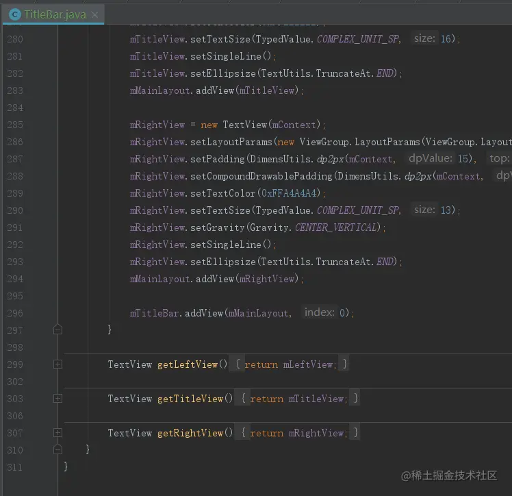 使用这个Builder构建一个LinearLayout,然后往LinearLayout添加三个TextView,最后将这个LinearLayout添加到TitleBar中