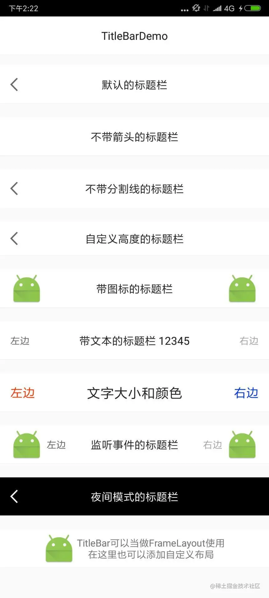 有细心的同学就会发现了第一张图中的状态栏颜色和Title的颜色明显不搭,这是因为我们使用了沉浸式状态,而这个TitleActionBar对沉浸式状态不是很友好,第二张图就显得比较友好了,接下来让我们用纯手工编写一个通用的TitleBar吧