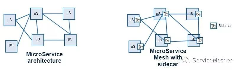 带有和不带sidecar的微服务架构。使用sidecar=服务网格