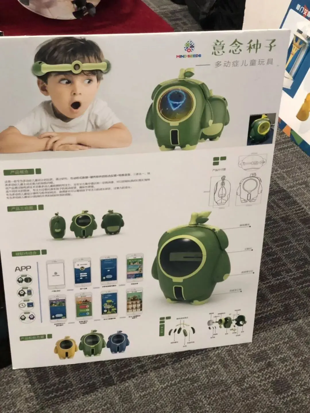 下面介绍一款神奇的产品,只要戴头箍的人集中注意力并达到阀值,头箍所连接的幻影灯就会显示小鱼、小树等各式可爱的动画。这款叫做“意念种子”的神奇产品是一件专门设计出来用以训练多动症儿童注意力的智能玩具。它用游戏的方式,改善多动症儿童的专注度。而它也是2017年中美青年创客大赛第二名的产品哦!