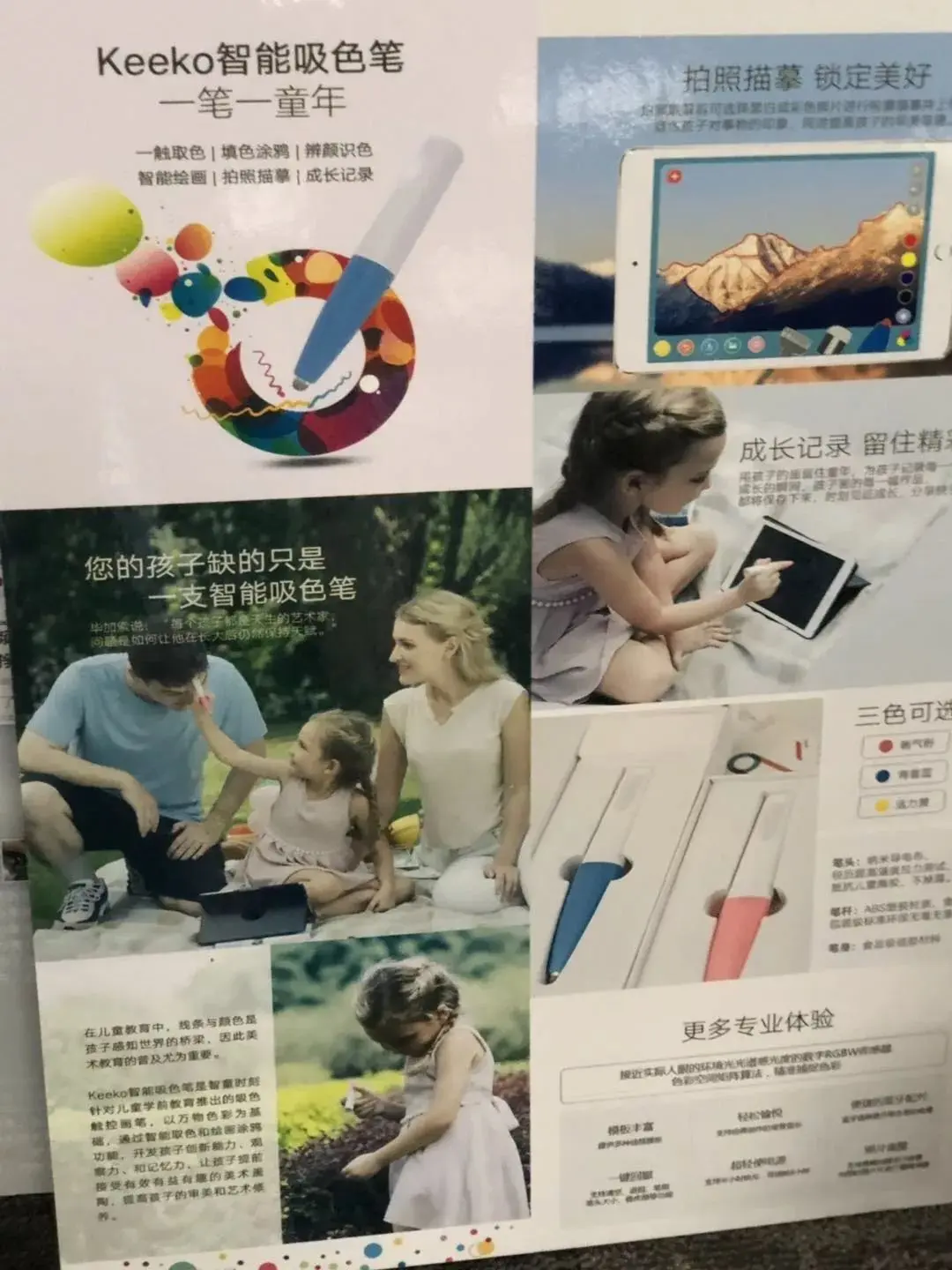 Keeko智能吸色笔是智童时刻针对儿童学前教育推出的吸色触控画笔,可以吸取自然界中65000种颜色,让孩子可以随时捕捉生活中的色彩灵感进行创作。它可以通过智能取色和绘画涂鸦功能,开发孩子创新能力、观察力和记忆力,让孩子提前接受有效有益有趣的美术熏陶。