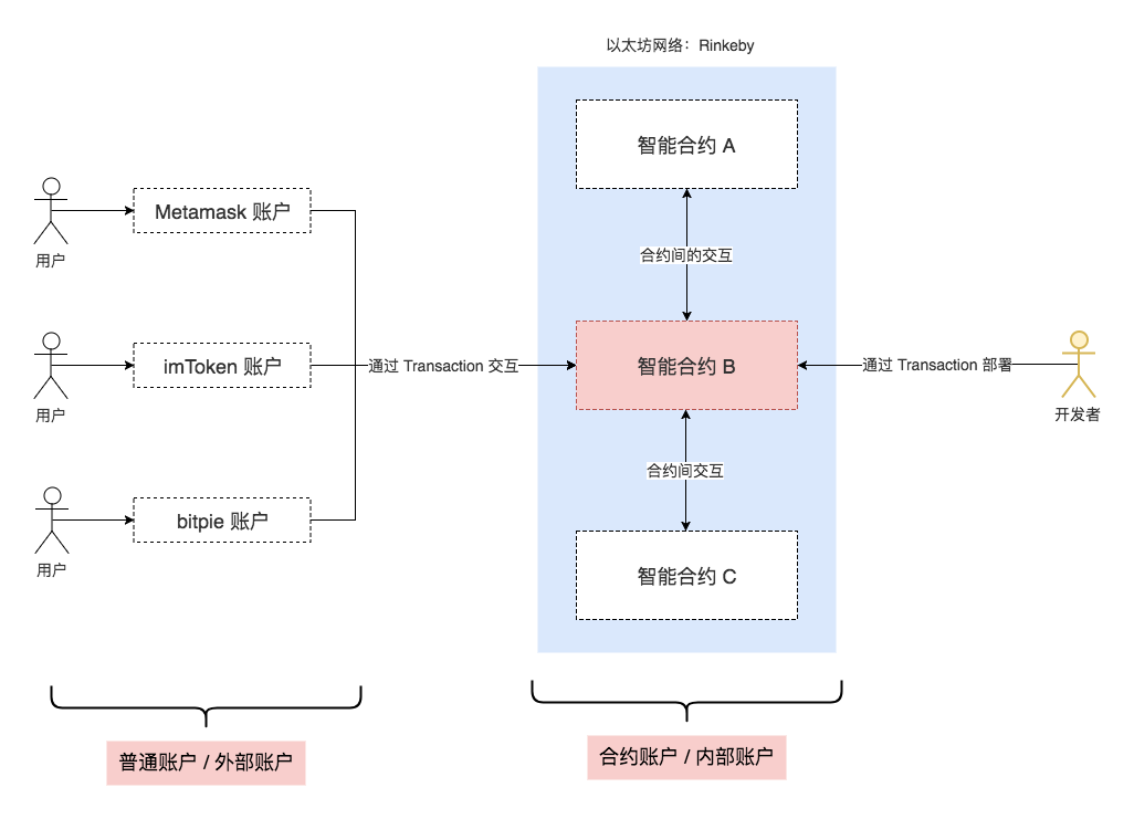 智能合约指以太坊网络上被代码控制的一个账户,不同于我们使用各种钱包软件 创建的账户(由创建账户的用户来控制),智能合约对应的账户是由代码控制的,其他账户(包括智能合约账户、普通用户账户)可以通过交易(Transaction)的方式与智能合约账户交互,社区中也会把智能合约账户称为内部账户,而普通用户账户称为外部账户...