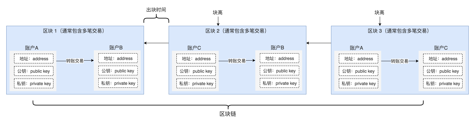 - 账户(Account) 由地址、公钥、私钥3部分构成,其中地址相当于用户名,而公钥+私钥相当于密码