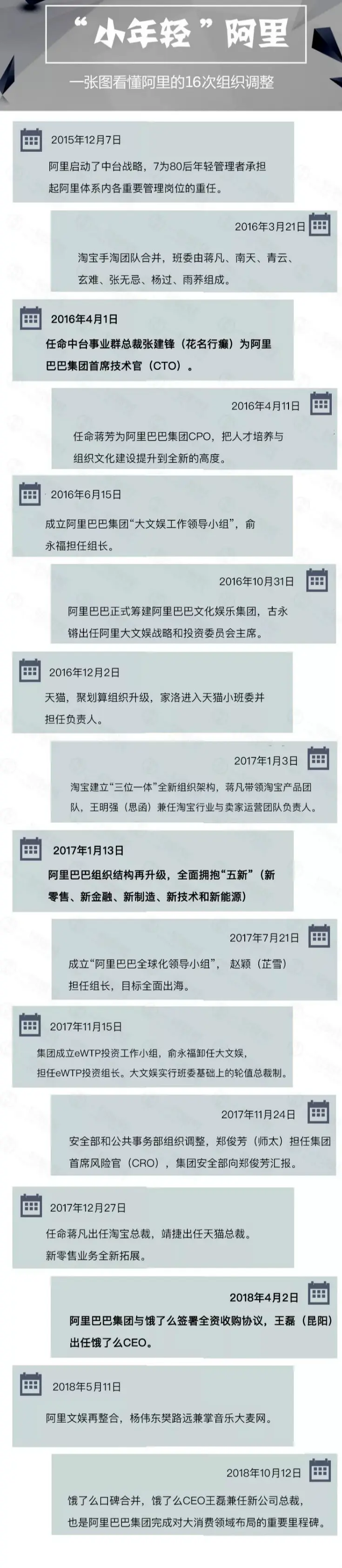 在阿里历次组织架构调整中,新一代人才都发挥着重要作用,成立19年,阿里的人才管理梯队却呈现出愈发年轻的态势。