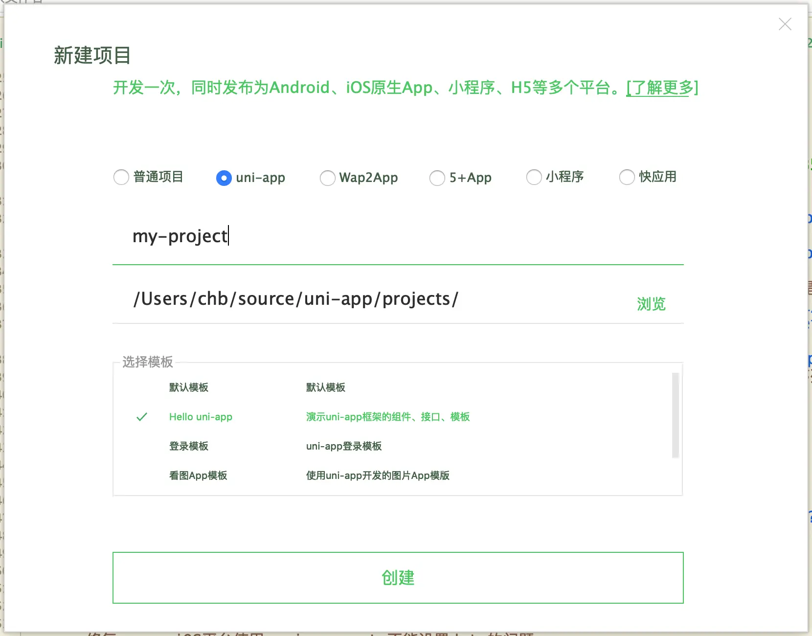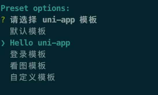 此时,会提示选择项目模板,初次体验建议选择 hello uni-app 项目模板,如下所示: