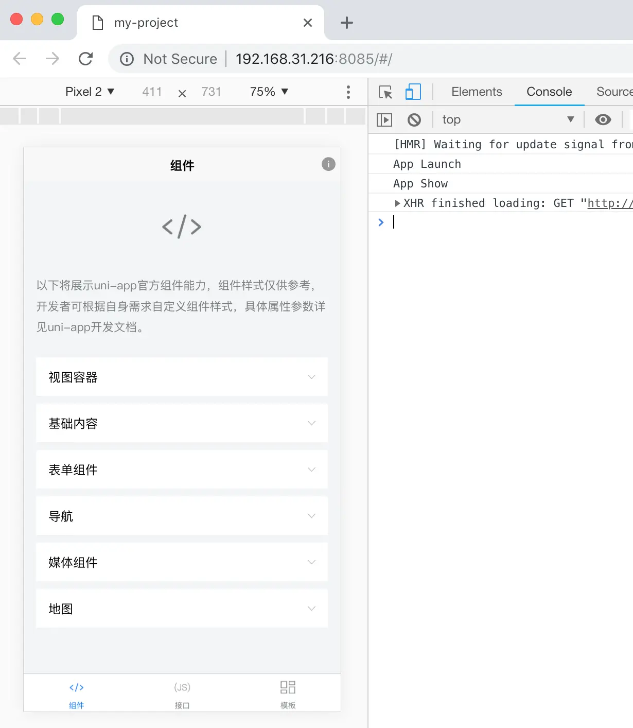 uni-app支持通过 HBuilderX可视化界面、vue-cli命令行两种方式快速创建项目,两种模式运行到H5平台后,都支持热重载。