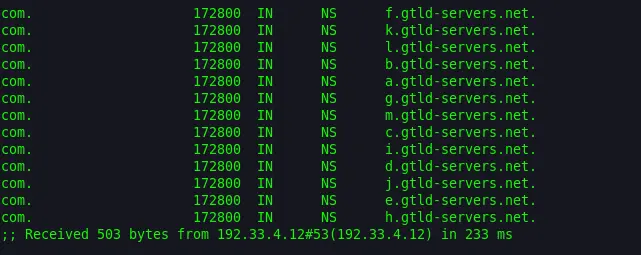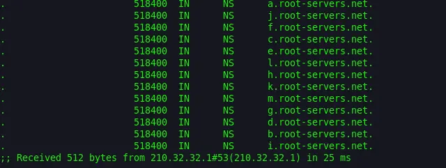 第一步是向我这台机器的ISPDNS获取到根域服务区的13个IP和主机名[b-j].root-servers.net.。