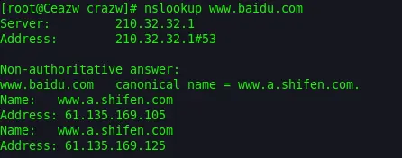 实际的结果是虽然dns.baidu.com返回了a.shifen.com域的服务器地址和IP,