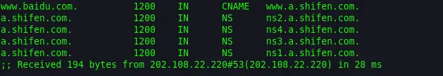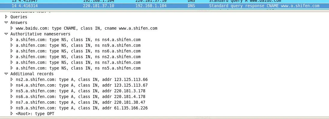这个图充分说明了返回cname的同时也返回了ns2.a.shifen.com的IP。