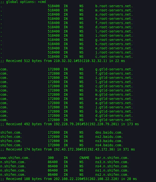 你会发现第三步时shifen.com这个顶级域的域名服务器和baidu.com这个域的域名服务器是同一台主机(即:dns.baidu.com)!