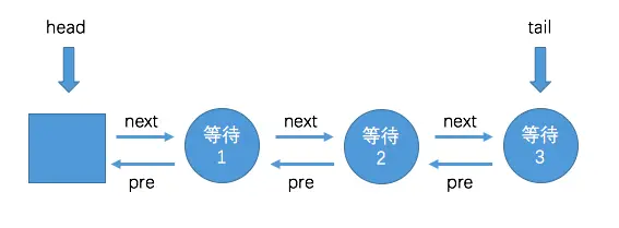 所有未获取到锁的线程,都会进入AQS的等待队列,其实就是一个双向链表,如下图: