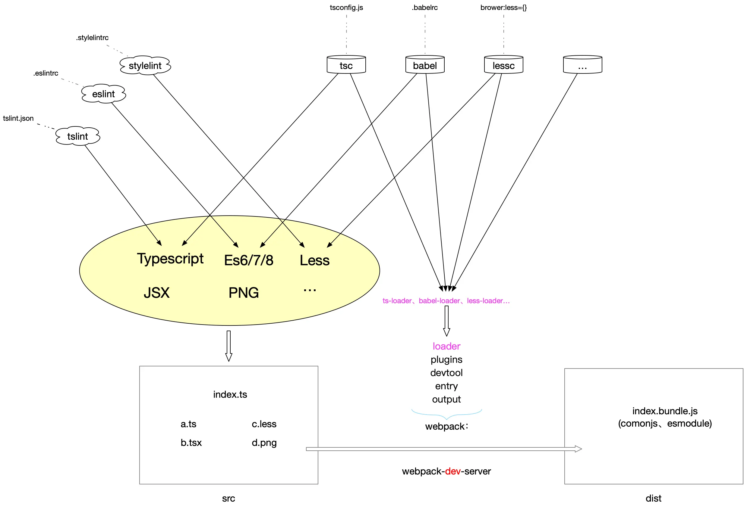 也没问题,于是针对各种技术域就有了各种 loader:ts-loader、babel-loader、less-lodaer...