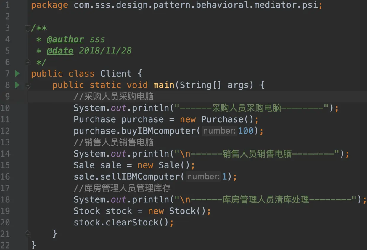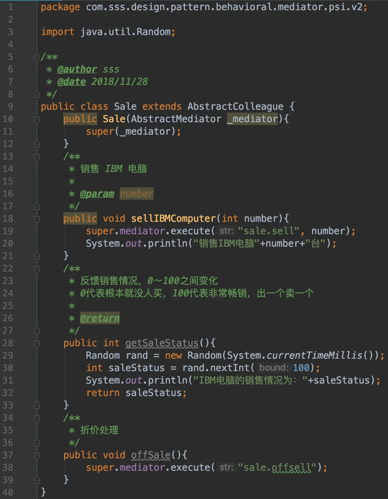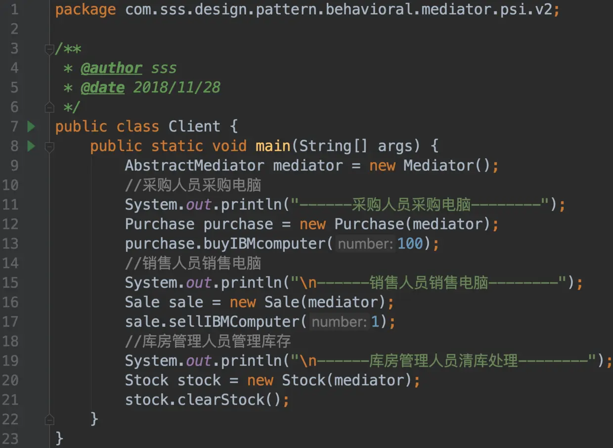 - 同事本身的行为 比如改变对象本身的状态,处理自己的行为等,这种行为叫做自发行为(Self-Method),与其他的同事类或中介者没有任何的依赖