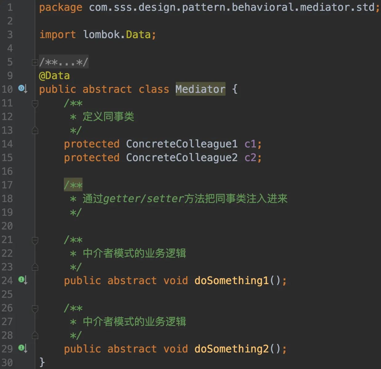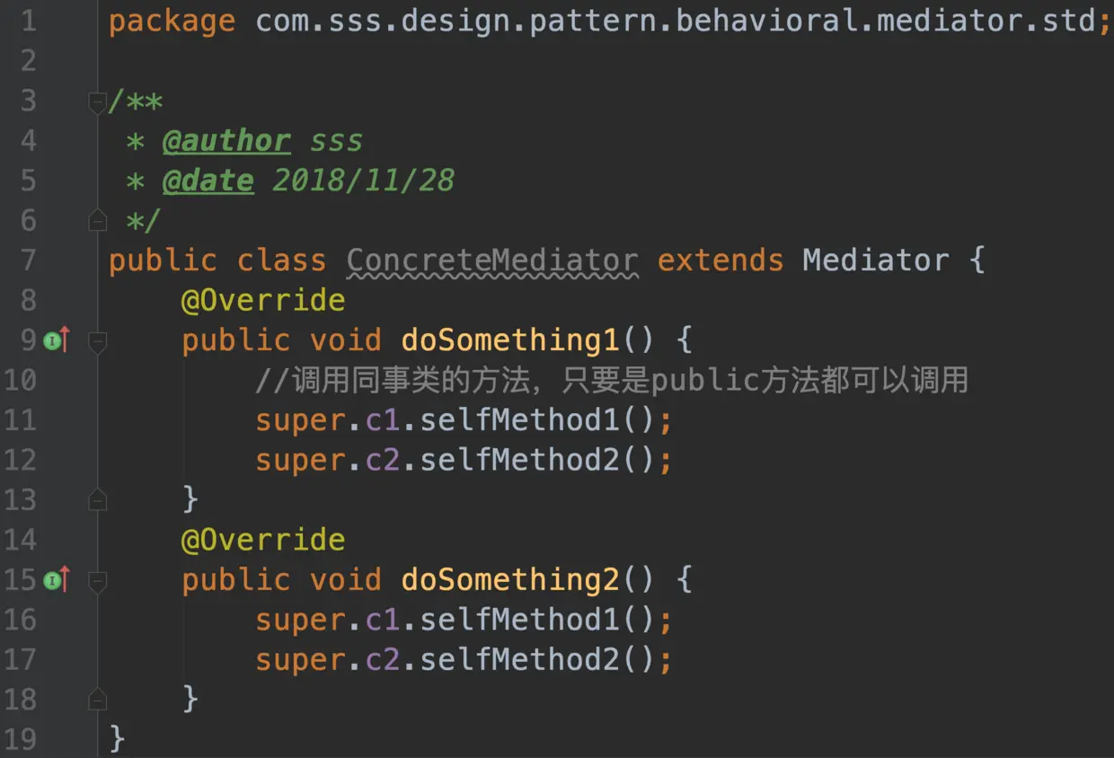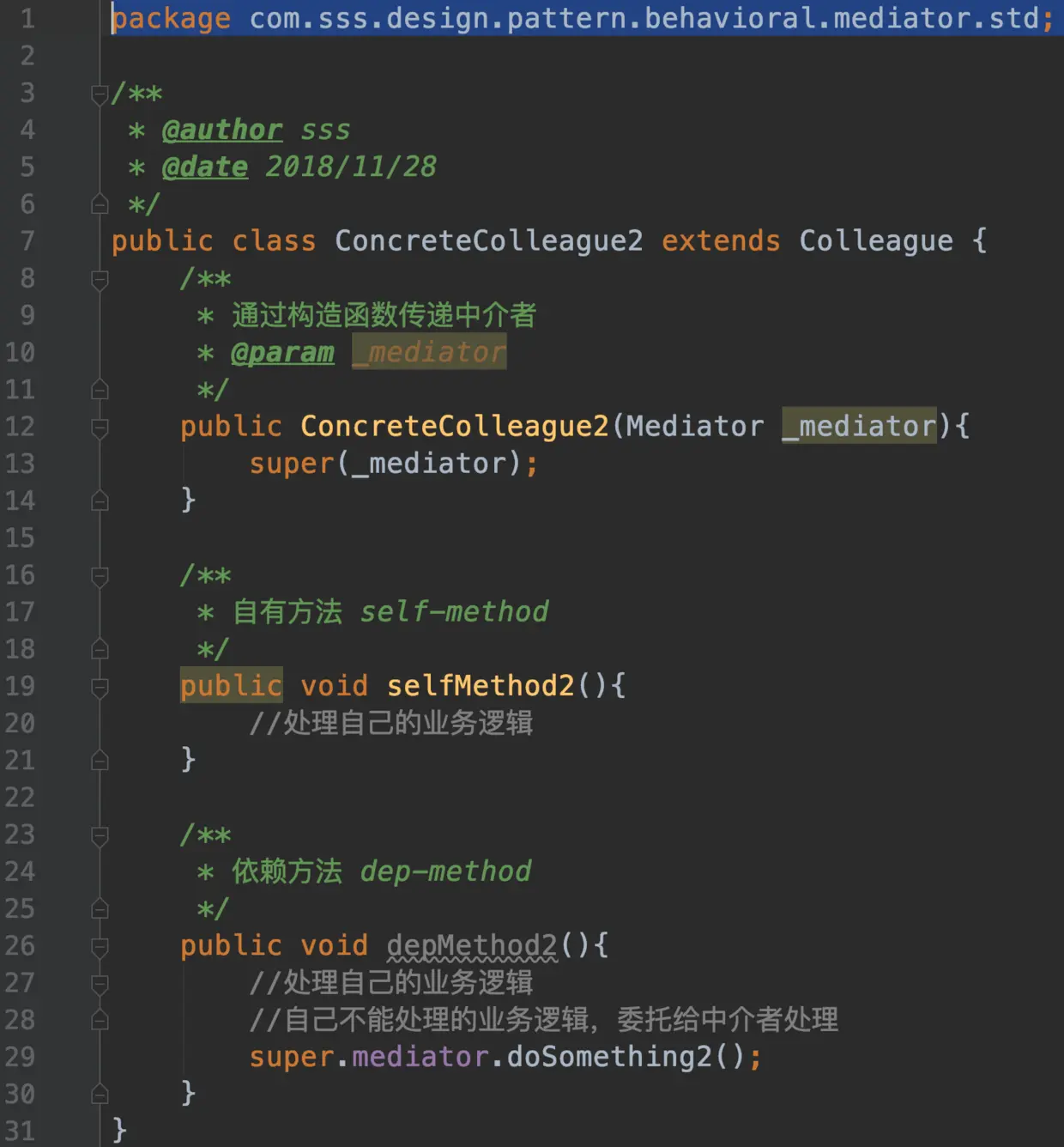 doSomething1和doSomething2都是比较复杂的业务逻辑,为同事类服务,其实现是依赖各个同事类来完成的。