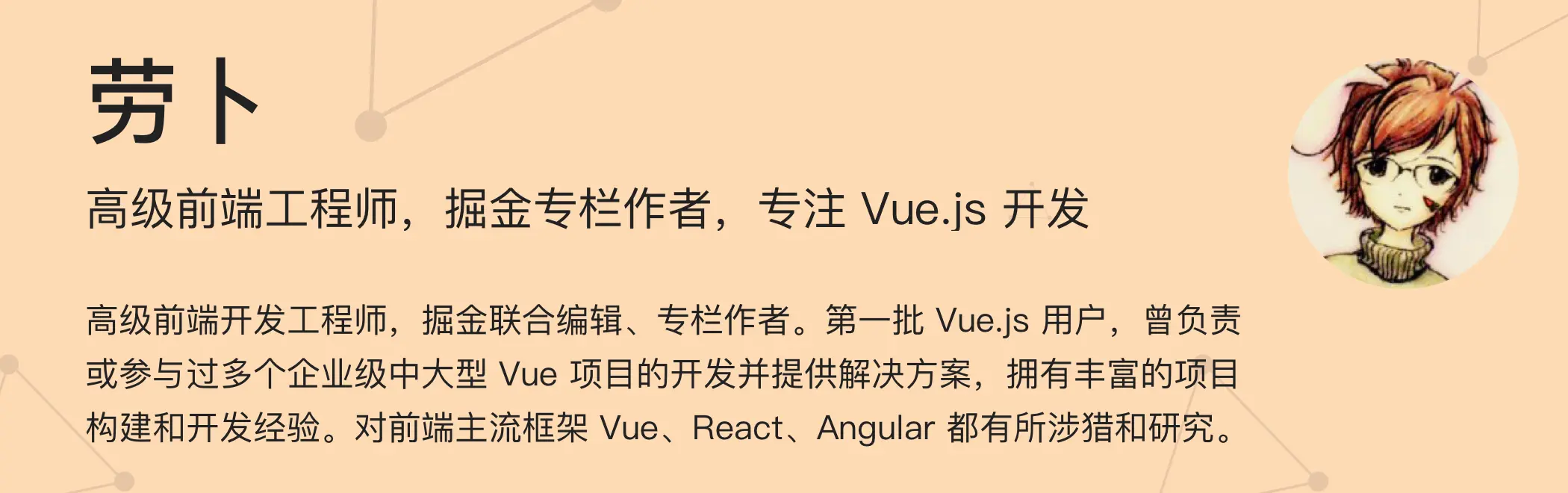 劳卜,高级前端开发工程师,掘金联合编辑、专栏作者。第一批 Vue.js 用户,曾负责或参与过多个企业级中大型 Vue 项目的开发并提供解决方案,拥有丰富的项目构建和开发经验。对前端主流框架 Vue、React、Angular 都有所涉猎和研究。