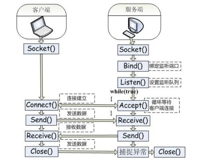 首先,服务端初始化ServerSocket,然后对指定的端口进行绑定,接着对端口及进行监听,通过调用accept方法阻塞,此时,如果客户端有一个socket连接到服务端,那么服务端通过监听和accept方法可以与客户端进行连接。