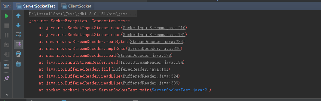 然后好多童鞋,就拷贝这个java.net.SocketException: Connection reset上王查异常,查询解决方案,搞了半天都不知道怎么回事。解决这个问题我们首先要明白,socket通信是阻塞的,他会在以下几个地方进行阻塞。第一个是accept方法,调用这个方法后,服务端一直阻塞在哪里,直到有客户端连接进来。第二个是read方法,调用read方法也会进行阻塞。通过上面的示例我们可以发现,该问题发生在read方法中。有朋友说是Client没有发送成功,其实不是的,我们可以通debug跟踪一下,发现客户端发送了,并且没有问题。而是发生在服务端中,当服务端调用read方法后,他一直阻塞在哪里,因为客户端没有给他一个标识,告诉是否消息发送完成,所以服务端还在一直等待接受客户端的数据,结果客户端此时已经关闭了,就是在服务端报错:java.net.SocketException: Connection reset